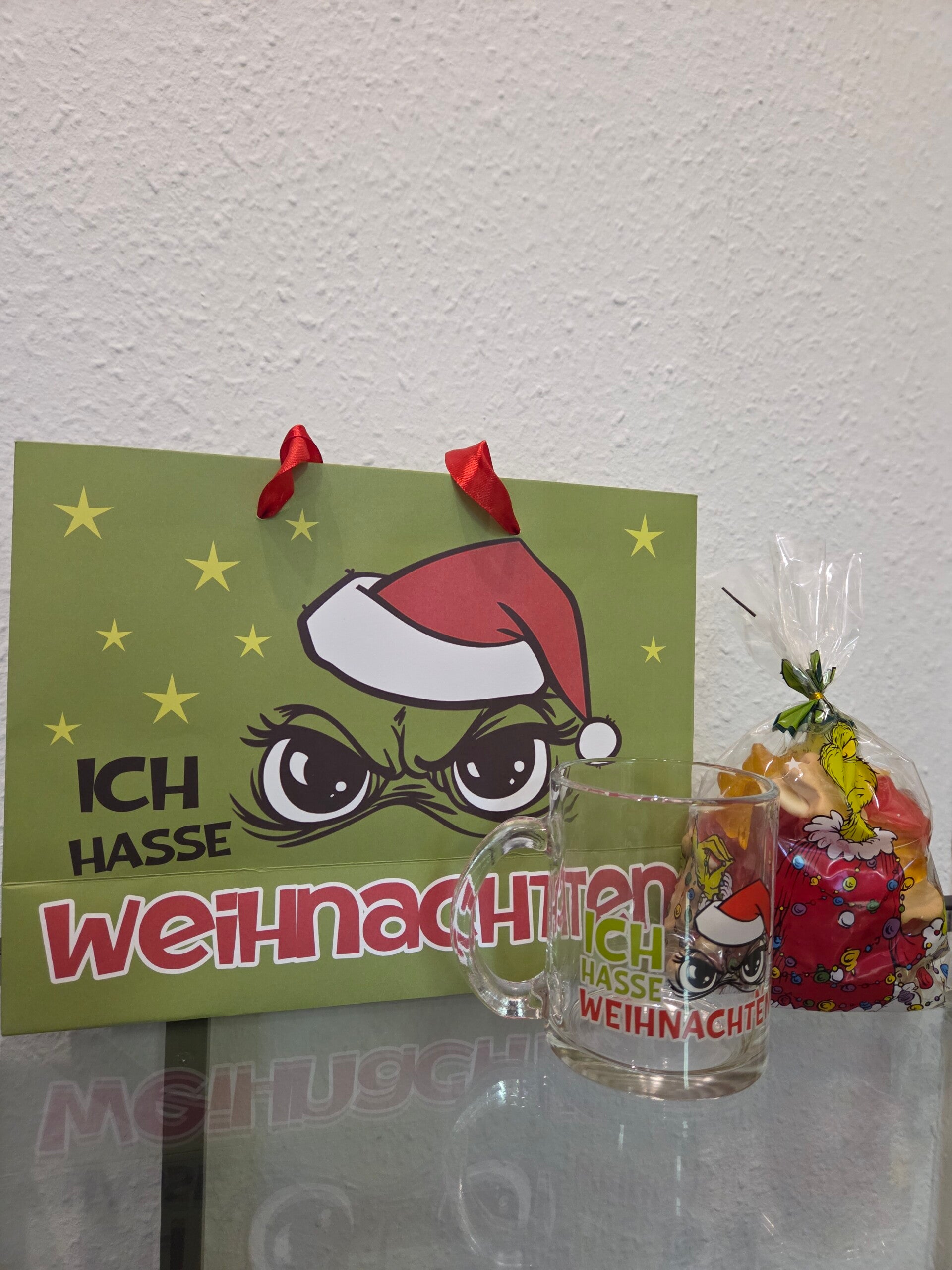 Inhalt: Grinch Tüte + Glas + 300g Candymix ( Lebkuchen Fruchtgummi, Fruchtgummi im Weihnachtsdesign, Eierpunsch Elche & Glühwein Sterne )